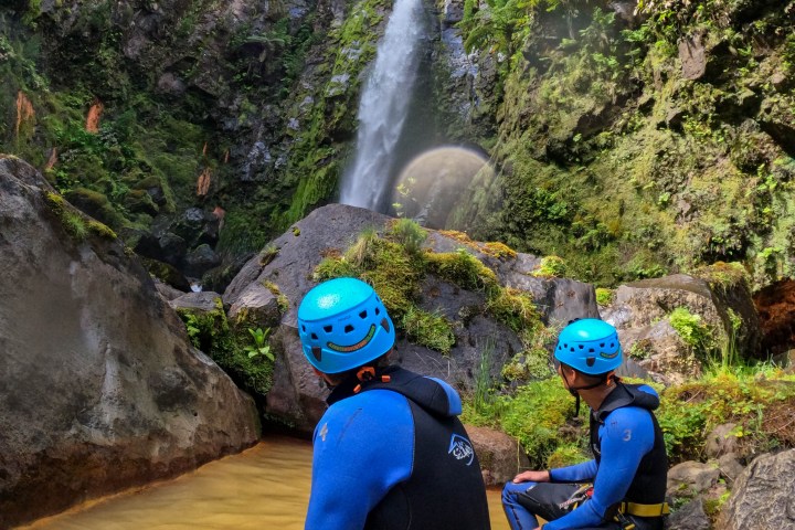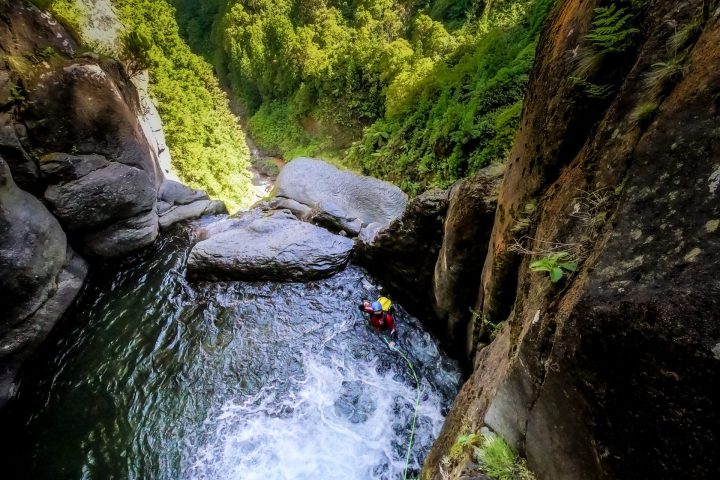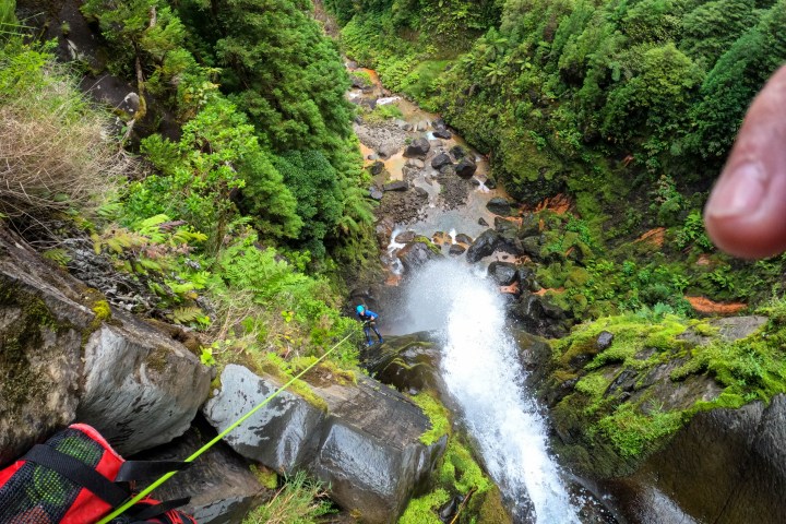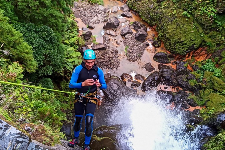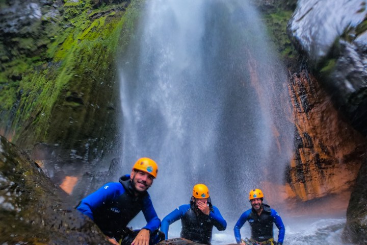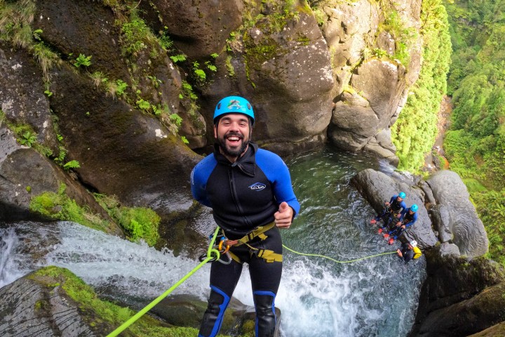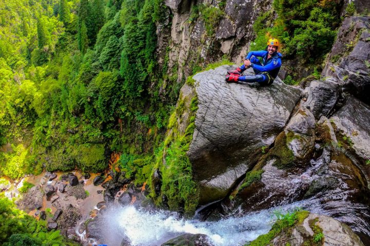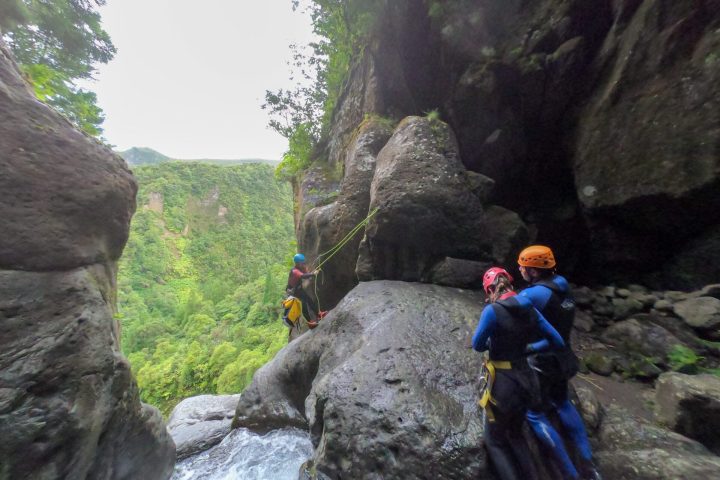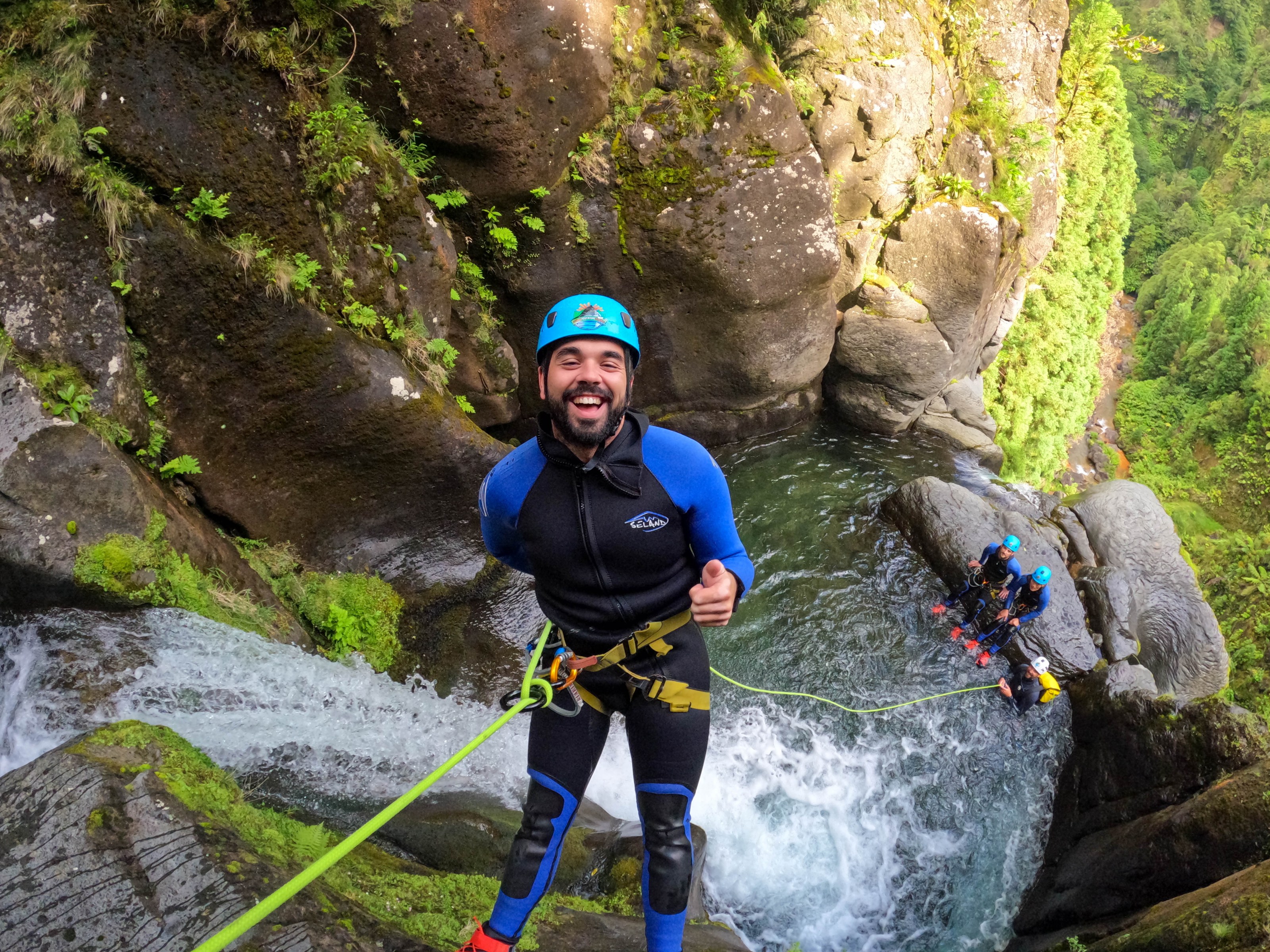 Start and finish very close to a natural sparkling water spring (from which you can actually drink!). We make the first splash with a small jump and then onto a “rappelling warm-up” on two waterfalls before experiencing the beauty of a 50 meter (165ft) waterfall that is complemented with small hot water spring on the its bottom. We Hike our way out of the canyon through an intense but beautiful trail through the Azorean endemic forest.