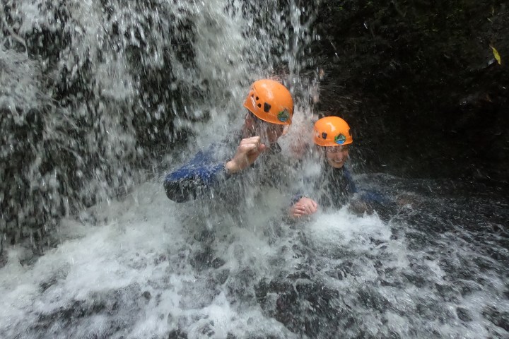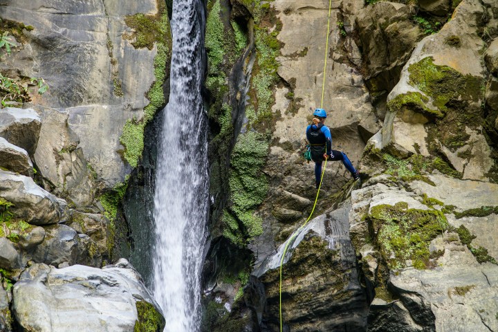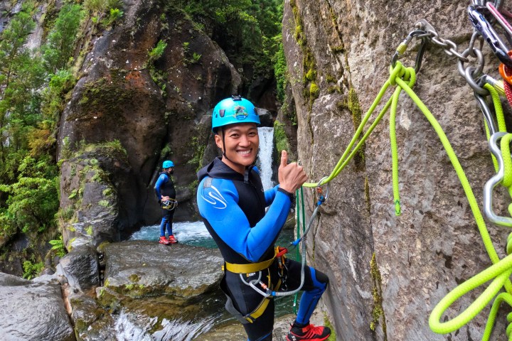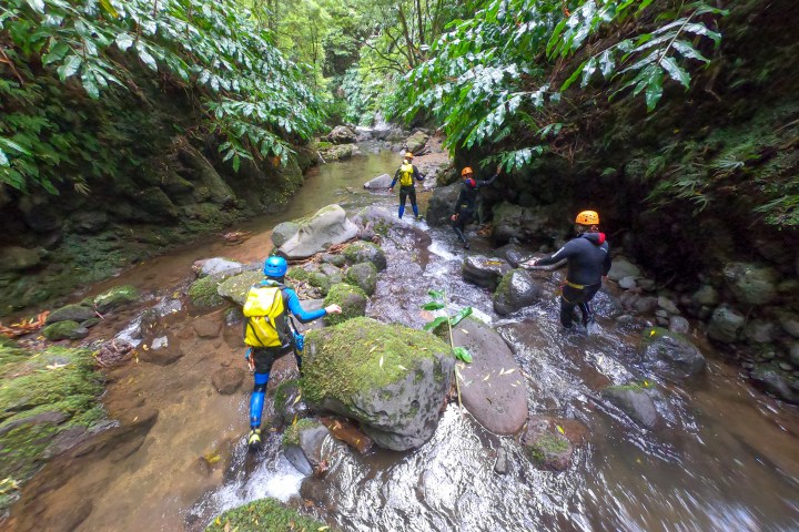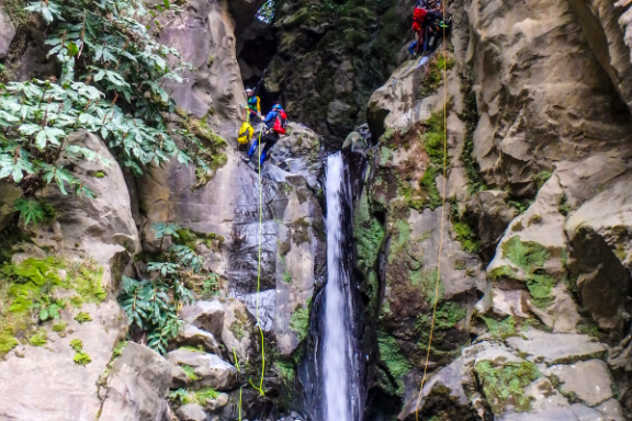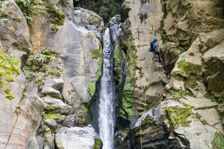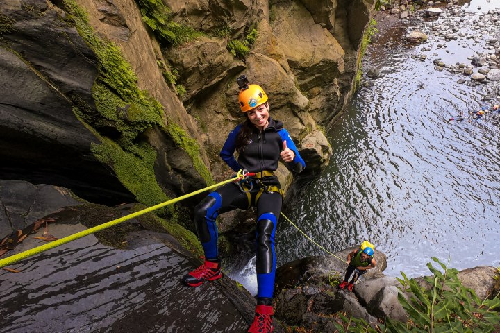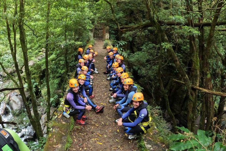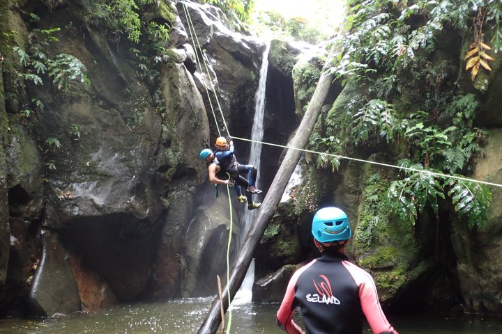 Arriving at the activity site, our guides will give you an overview of the adventure, brief you on the safety basics and instruct you how to gear up. At key spots additional safety and technical briefings will be provided. We start with a hike along an old hydroelectric power plant and then through volcanic fumaroles that show that the island is still “very alive”. This approach will take around 20 minutes. On the canyon you’ll experience rappelling a series of great waterfalls that lead to the final mind-blowing 25 meter (82ft) rappel at Salto do Cabrito!